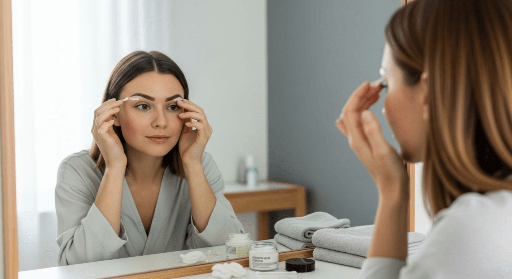 - Nettoyage délicat : Nettoyez délicatement vos sourcils avec un coton imbibé d’eau stérile ou de solution saline, selon les recommandations de votre praticien. Cela permet d’éliminer toute impureté et de maintenir la zone propre sans perturber le pigment. Évitez les produits contenant de l’alcool ou des agents agressifs.