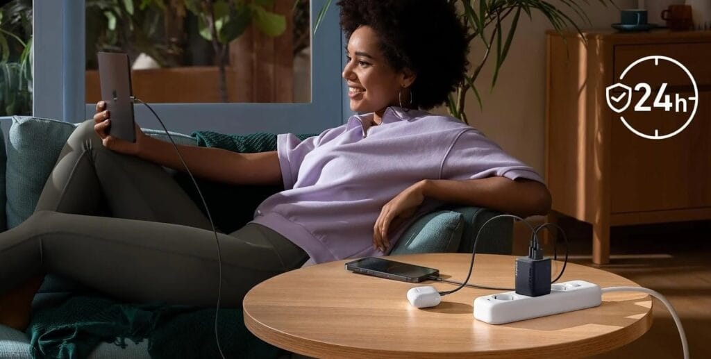 Pour plus de sécurité, le produit utilise la technologie avancée GaN et la technologie ActiveShield 2.0. L’application de la technologie GaN permet au chargeur d’atteindre un rendement de conversion énergétique plus élevé tout en conservant une taille compacte, réduisant ainsi la production de chaleur. ActiveShield 2.0 utilise un système de contrôle intelligent de la température pour surveiller en permanence les températures de fonctionnement et ajuster la puissance de sortie si nécessaire afin de garantir que la charge reste dans des paramètres sûrs. Cette double technologie offre une protection complète aux appareils connectés, prévenant efficacement les risques liés à la sécurité tels que la surcharge et la surchauffe.